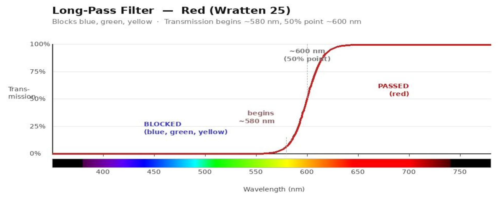 These are the colours that a filter can engage with directly at the physical level. When a red filter transmits 620nm light, it is working with a real, measurable wavelength. The physics is clean and straightforward.