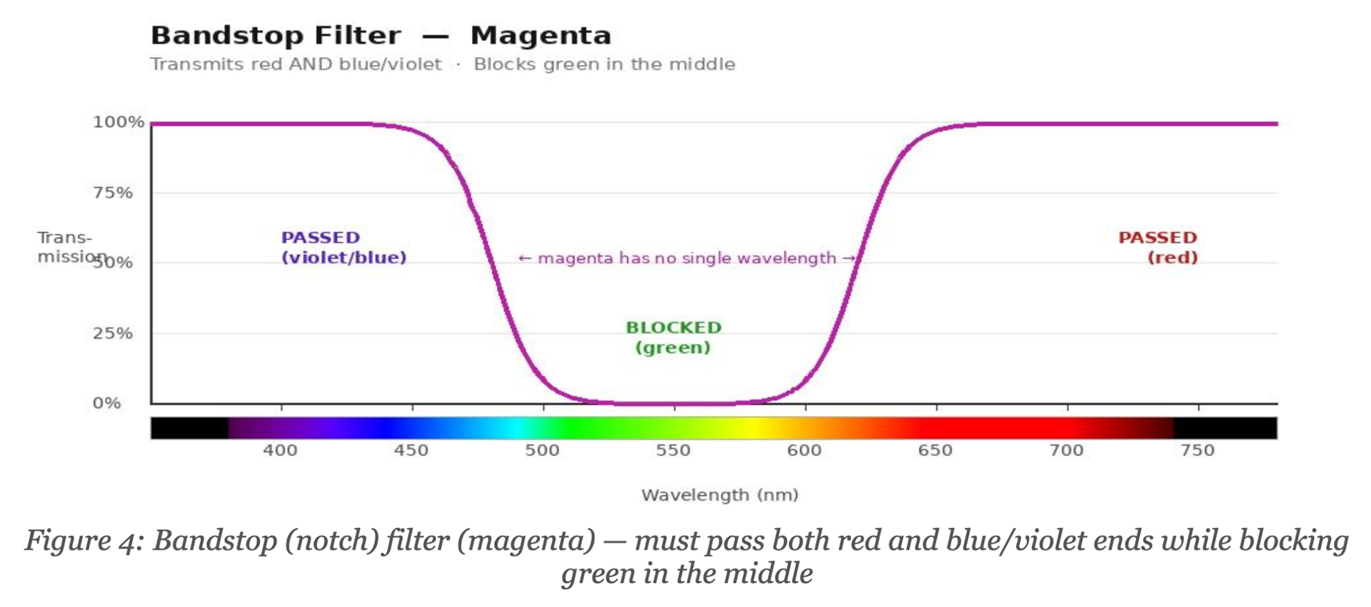 For filter design, this has real consequences. A magenta filter cannot simply pass 'magenta wavelengths' because there are none. Instead, a magenta filter must transmit both the red end and the blue/violet end of the spectrum while blocking the green middle. This makes it technically a bandstop or notch filter — a more complex transmission curve than a simple long-pass red or short-pass blue filter.