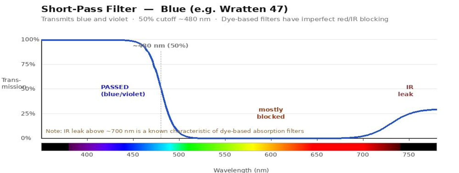 There is a pleasing symmetry in how both ends of the spectrum cause problems for photographers. Blue filters, being short-pass, tend to also transmit ultraviolet light, which sits just beyond the violet end of the visible range. Since film and digital sensors are often sensitive to UV, this can introduce unwanted haze or exposure shifts unless a dedicated UV-blocking coating is also present.