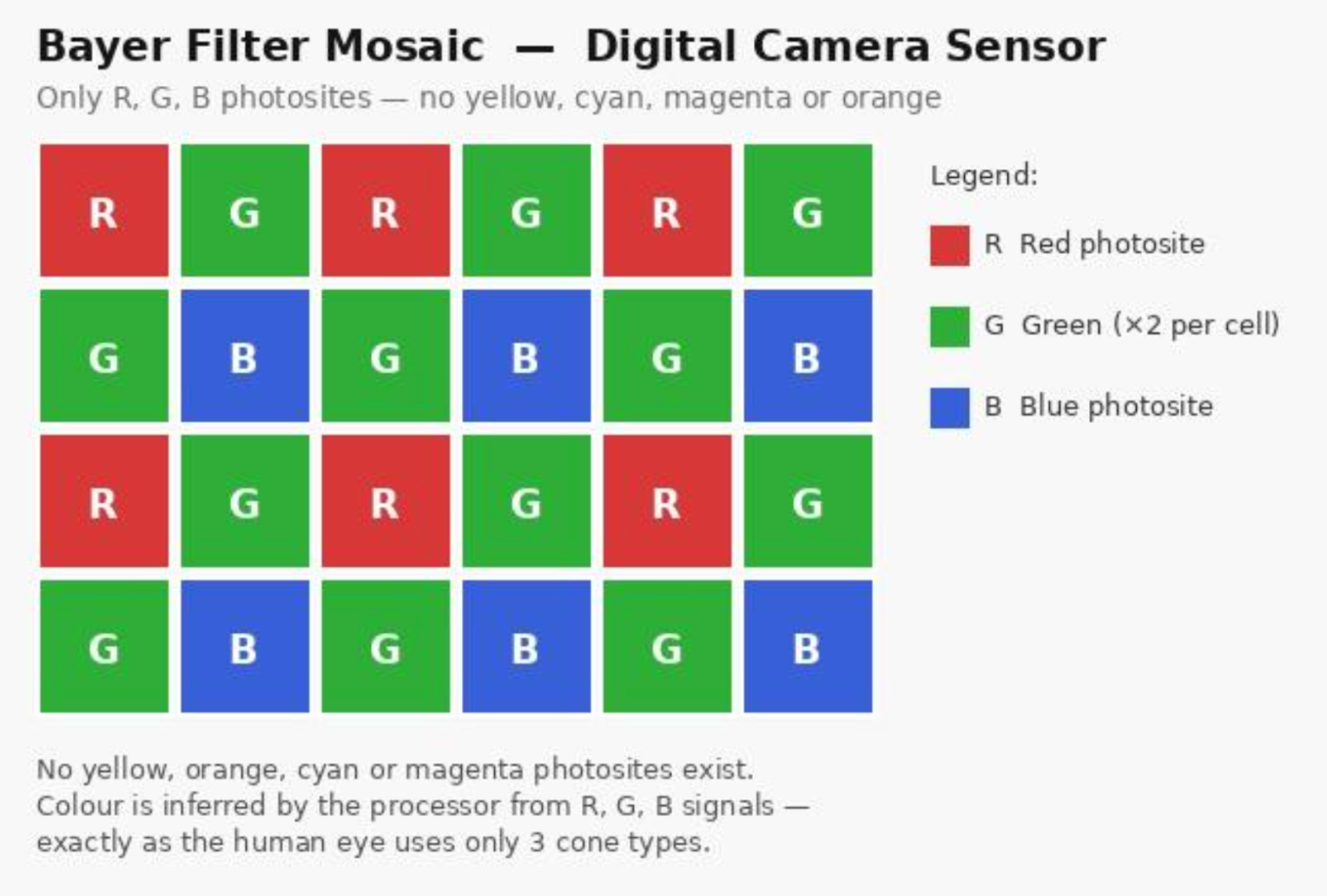 A typical colour digital sensor uses a Bayer filter mosaic — a grid of tiny colour filters placed over individual photosites on the sensor, with roughly half the photosites covered by a green filter, a quarter by red, and a quarter by blue. Each photosite measures only the intensity of light in its own colour channel. The sensor has no yellow photosites. It has no orange photosites, no cyan photosites, no magenta photosites. Like the three cone types in the human eye, the sensor captures the entire range of colour using only three channels — red, green, and blue — and everything else is inferred.