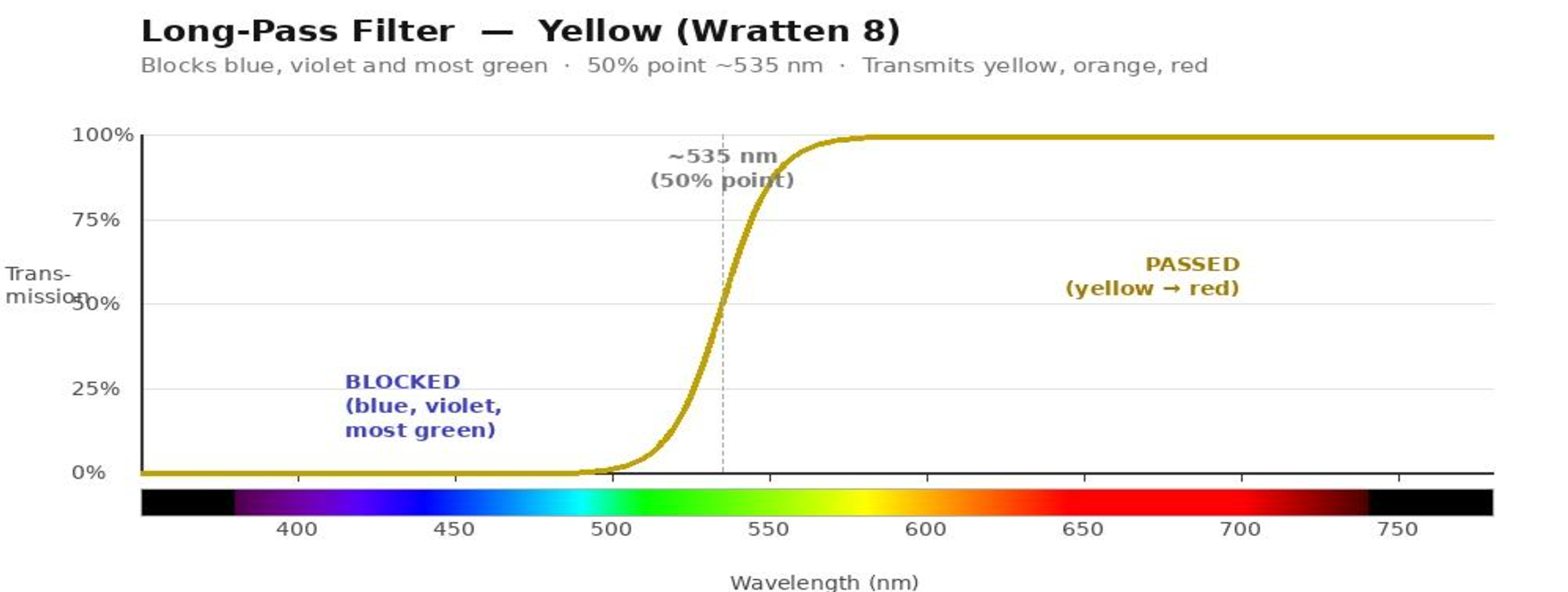 A yellow filter (such as the Wratten 8) is also a long-pass filter, beginning to transmit meaningfully from around 500nm upward. Despite its name suggesting a narrow slice of the spectrum, it passes yellow, orange, and red while attenuating greens and strongly blocking blues and violets. The effect in black and white photography is subtler than a red filter — a moderate darkening of blue sky and a slightly warmer, more natural rendering of skin tones and foliage.