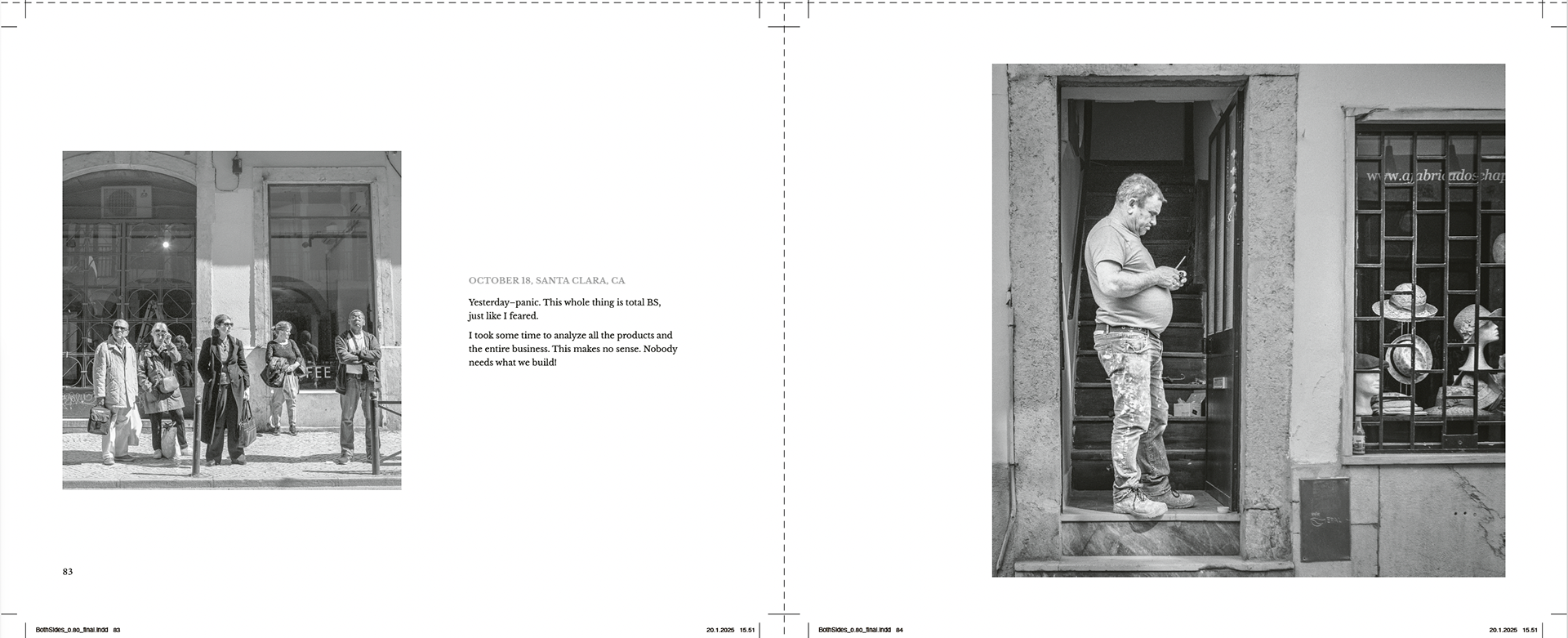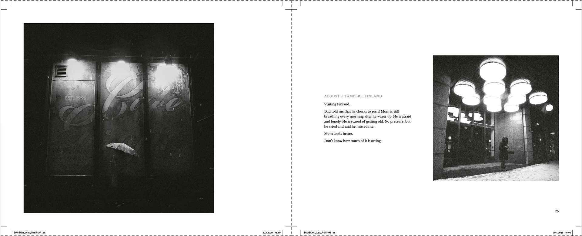 Rather than illustrating one another, photographs and texts operate as parallel constructions. Their sequencing in book form compresses time and foregrounds the gap between experience, recording, and later reworking.