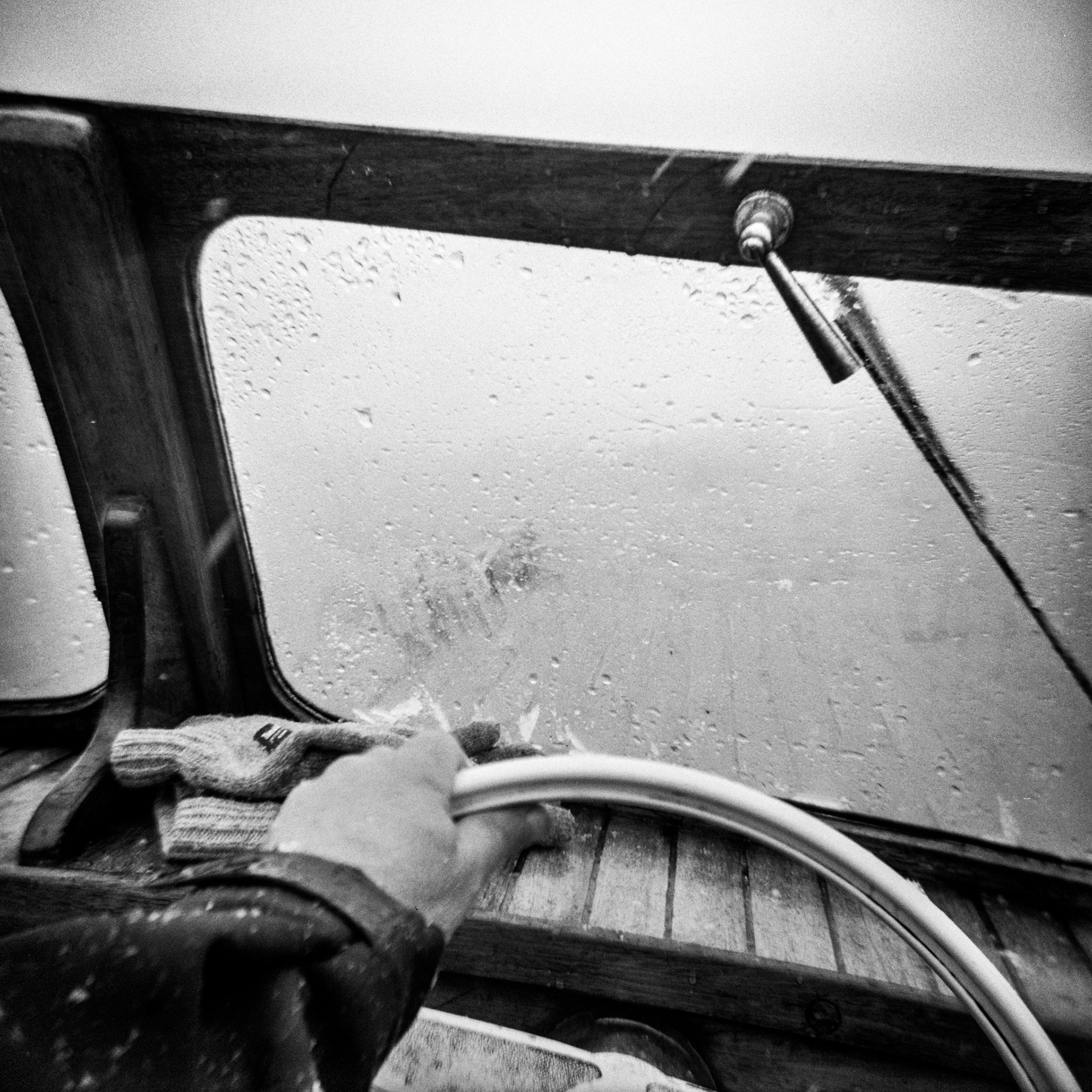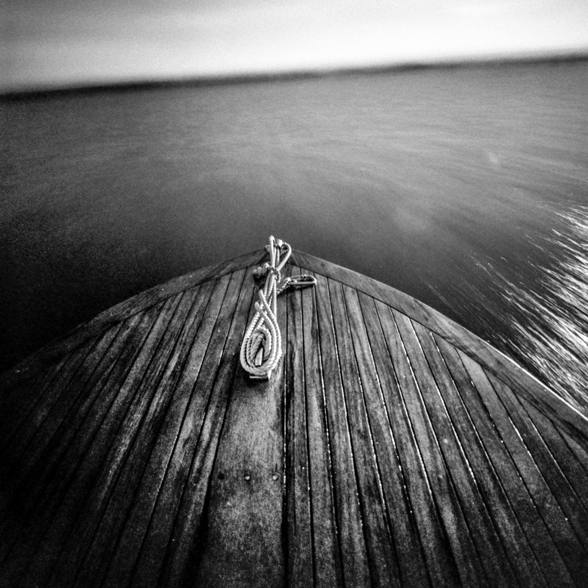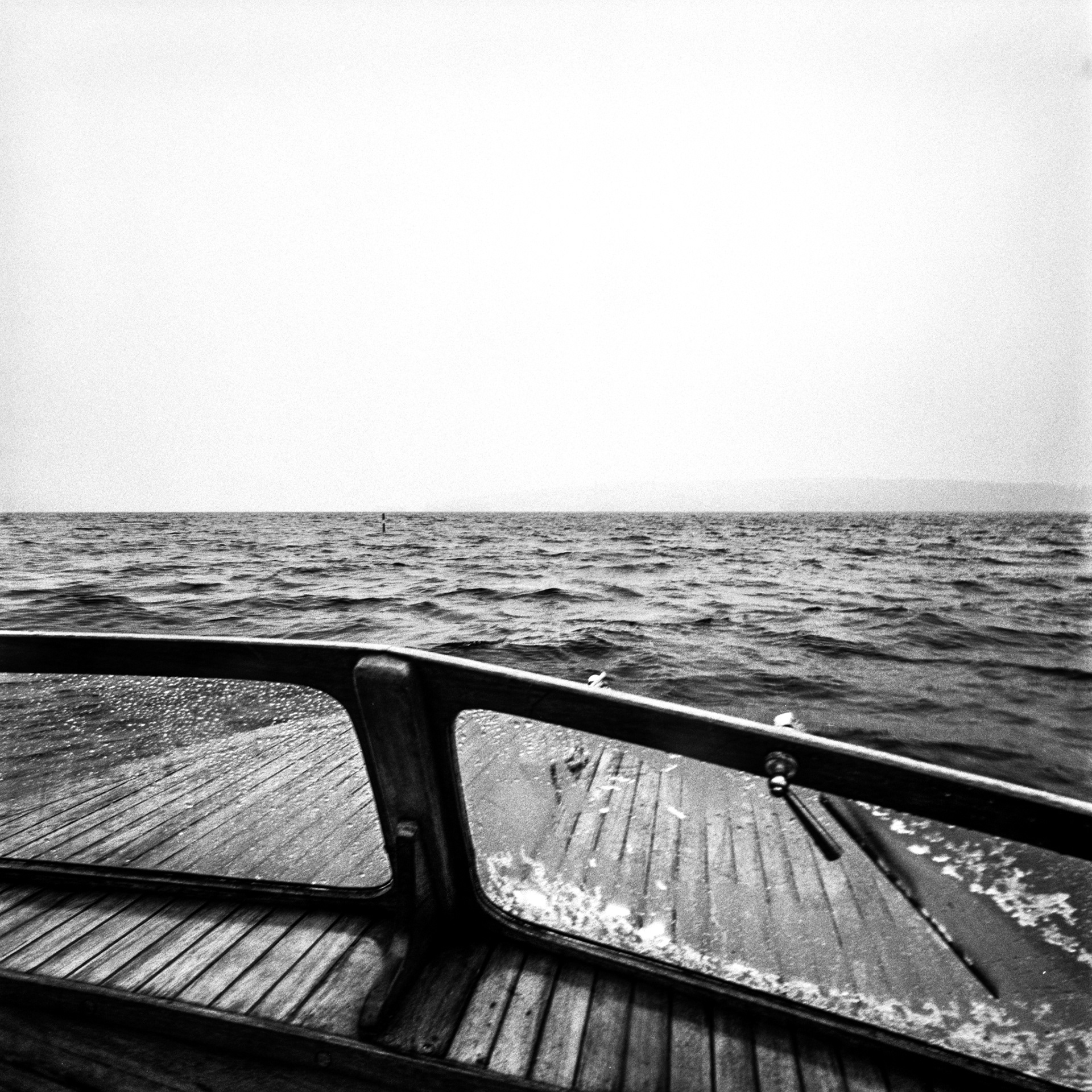 On the lake, I'm alone in my wooden boat. The shore disappears. Land becomes distant. I escape into open water, rough weather, changing light. The boat moves through spray and reflection, sky meeting water.