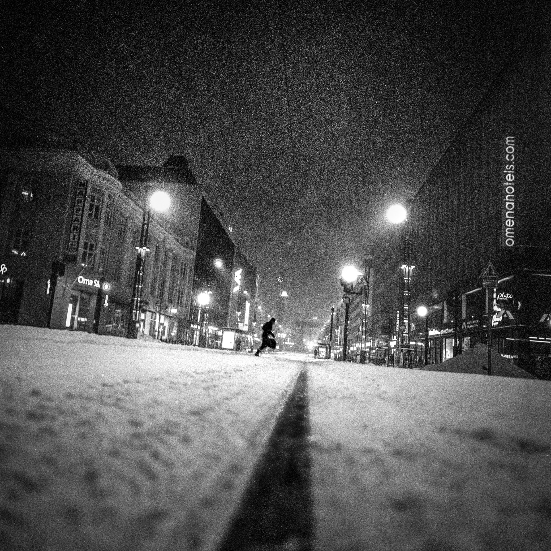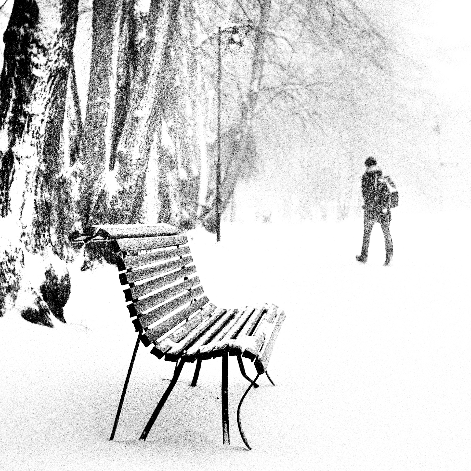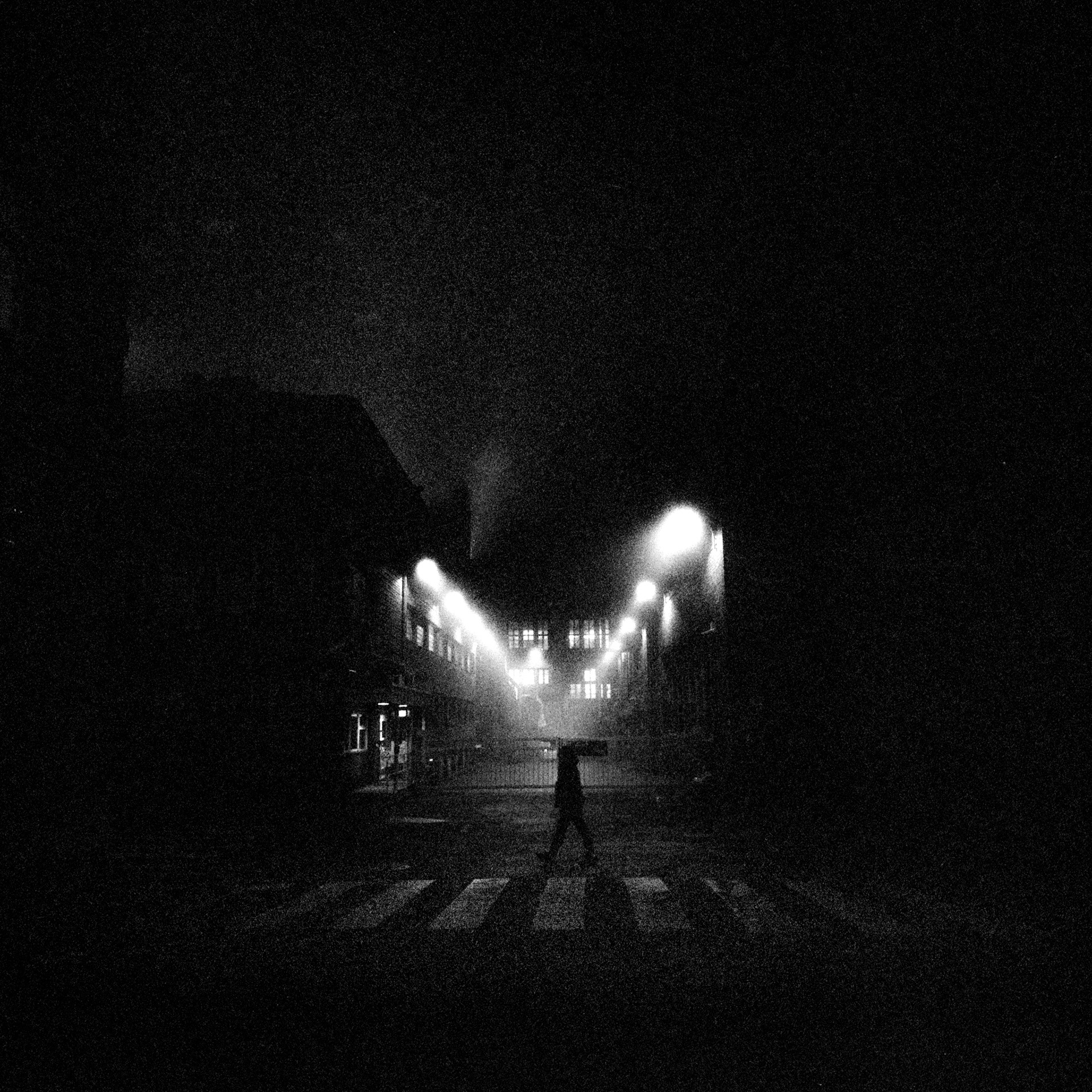 In the city, long straight streets vanish into snowstorms and darkness. One or two figures move through empty roads under streetlights that barely illuminate. Everything disappears - into weather, into night, into the distance between buildings.